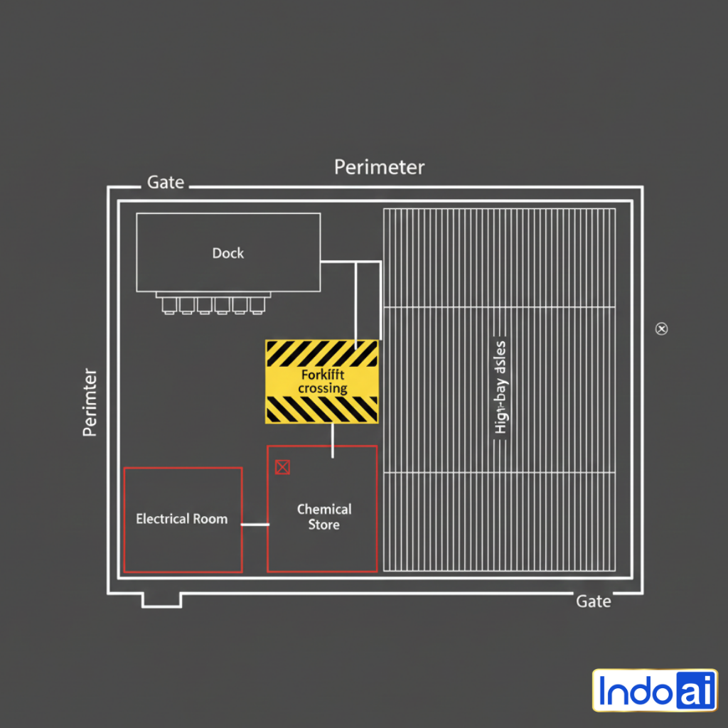- Zone map (gates, docks, aisles, perimeter, hazardous rooms)